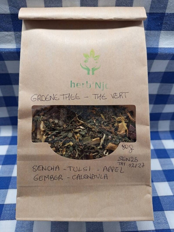 Thé vert Sencha, Tulsi (Basilic sacré), Pomme, Gingembre, Calendula.